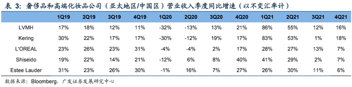 从公司层面看,根据各公司财报,奢侈品集团Kering和LVMH亚太区(除日本) 2021财年增速分别为33%和37%,与集团整体增幅35%、36%相近;化妆品集团欧莱雅(北亚地区)、资生堂(中国地区)和雅诗兰黛(亚太地区)有机增速分别为18%、19%和22%,高于集团增速16%、12%和11%。多家奢侈品和化妆品集团均在财报中表示,中国大陆地区是重要增长引擎,如何将品牌在中国更好的本土化值得关注。