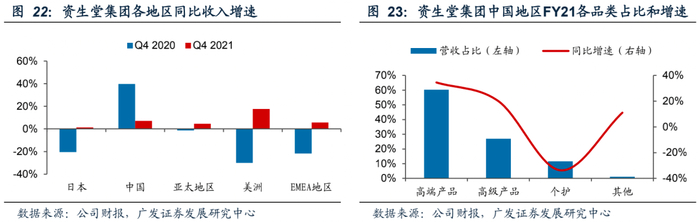 分地区看,21 Q4中国区销售额可比增速为7.1%,增速较Q3增加约5pp,全年销售额占集团总营收的26.5%,与日本本土占比接近。受益于“双十一”活动,FY21中国内地高端线增速达34%,销售额占比超60%。受疫情影响,日本市场Q4可比收入同比略增1.4%,与去年同期持平,但线上渠道销售额实现双位数的增长。亚太地区(除中国、日本)销售额可比增加4.5%,主要受线上渠道销售驱动。美洲、EMEA地区Q4销售额可比上升17.7%、5.7%,疫苗接种推动化妆品市场复苏,美妆、香水等品类的购买需求增强。