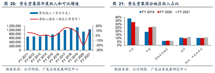 分渠道看,FY21电商渠道贡献占比提高至34%,销售额同比增长超20%,其中高端品牌线上占比约36%;旅游零售渠道可比销售额同比提高18.4%至1204.6亿日元,亚洲地区贡献主要营业收入,在疫情旅行限制下,海南免税线上业务销售增长明显。同时公司在海南增加了品牌专柜的数量,并加强Drunk Elephant的推广,进一步带动旅游零售业绩的恢复。