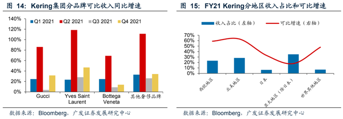 分品牌看,Gucci是集团营收增长引擎,FY21销售额占集团营收的55%,可比收入同比增长31.2%,其中21Q4可比收入同比提高31.6%,较19年同期增长17.8%;零售渠道收入占品牌总营收的91%,其中线上渠道收入全年增长超55%,占品牌总营收的16%;品牌在各个区域均实现可比收入增长,北美市场可比收入同比增速达67%。Gucci同时加大在营销方面的投入,电影《House Of Gucci》使得品牌知名度进一步提高。Saint Laurent FY21营收同比可比增速为45.6%,品牌在北美、西欧、亚太市场恢复势头强劲,可比收入增速分别为110%、38%和36%;所有渠道均实现双位数增长,其中线上渠道收入增长超80%。品牌调整批发商数量,同时将线上批发业务转为特许经营业务,以提高集团控制权;加速直营门店扩张,形成销售网络。Bottega Veneta 全年销售额可比增速为25.1%,Q4可比增长率为13.7%;北美市场和日本市场销售额提振品牌业绩,增速分别为83%、32%。其他品牌FY21可比收入同比上涨43.8%至32.6 亿欧元,品牌Balenciaga、Alexander McQueen等表现良好,珠宝品牌Boucheron、Pomellato及Qeelin快速扩张。
