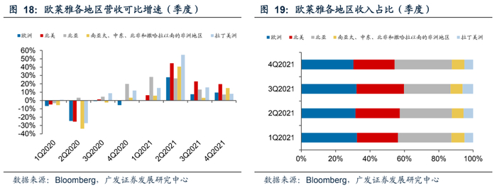 分地区看,21Q4销售均有大幅度的增长。根据公司财报,美国和亚洲市场实现双位数的增长。2021全年亚洲(除日本)市场占集团总收入的35%,Q4有机增速为16%,较三季度提升4pp。美国市场Q4有机增速为34%,较三季度提升6pp。日本市场在Q4强劲反弹,与疫情前销售额相比大幅增长。与19Q4相比,Q4销售额有机增速为31%,增幅较上季度大涨37pp,实现增速转正。欧洲市场逐步从疫情中恢复,Q4销售额有机增速为33%,较三季度提升10pp;较19年同期有机增长1%,在三季度基础上提高7pp,单季度初步恢复到疫情前水平。
