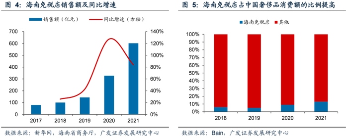 免税政策刺激境内奢侈品消费,各大品牌进入海南免税市场。据海南省商务厅数据,2021年海南免税店销售规模同比增长约84%至602亿元,其中奢侈品消费约占总销售额的95%。免税店的奢侈品消费集中在美妆板块,主要原因是海南免税店标价较品牌官方标价低30%-55%。雅诗兰黛、花王、欧莱雅、资生堂等国际美妆集团旗下品牌均通过海南离岛免税店进入中国奢侈品消费市场。欧莱雅集团2021年在以中国为主的北亚区域实现有机增速18%,由海南免税旺盛需求驱动的旅游零售是业绩增长的重要因素之一。除美妆外,奢侈品巨头开云集团旗下Gucci、YSL等品牌以及LVMH集团旗下Fendi也入驻海南免税城。