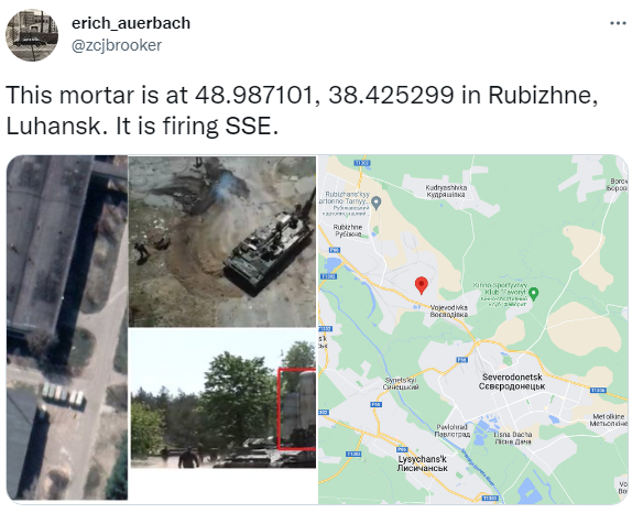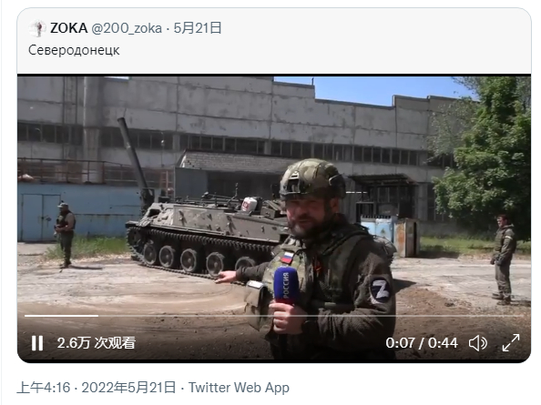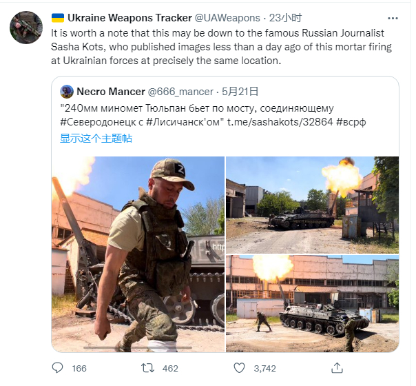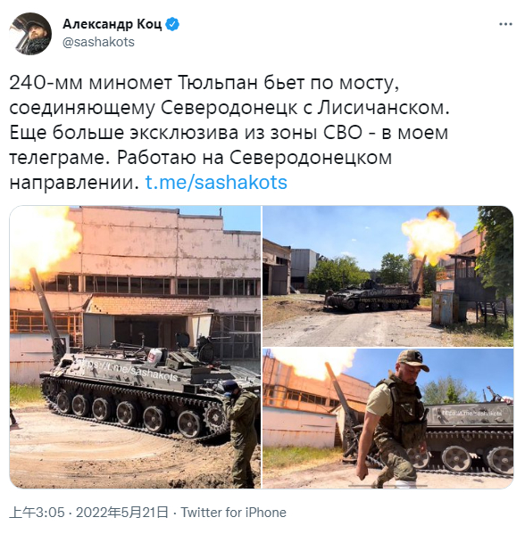 老刘又去查找了上文中提到的俄记者萨沙·科茨(Sasha Kots)的报道。这篇发布于21日的帖子,介绍了俄军一辆240毫米口径的“郁金香”迫击炮击中了连接北顿涅茨克和利西昌斯克的桥梁。这名俄记者还宣称,他在北顿涅茨克方向工作。
