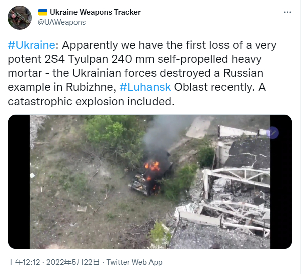 名为Ukraine Weapons Tracker的推特账号22日发布的画面,宣称一台俄罗斯2S4“郁金香”自行迫击炮,在卢甘斯克州鲁比日内城遭受致命打击,炮车燃起熊熊大火,后面的大片建筑也因为受到乌克兰军队的打击冒出阵阵浓烟,炮车接着发生剧烈爆炸。