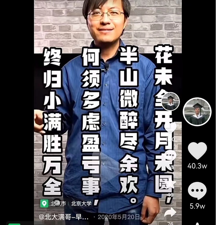 “小满这一天,刚好麦穗开始逐渐地饱满,但是还没有完全饱满,这种状态特别好,它代表了一种人生态度……这就代表着我们在追逐完美的路上,但不要求我们一定要十全十美。”短视频结尾,“北大满哥”将当年的诗再吟一遍。