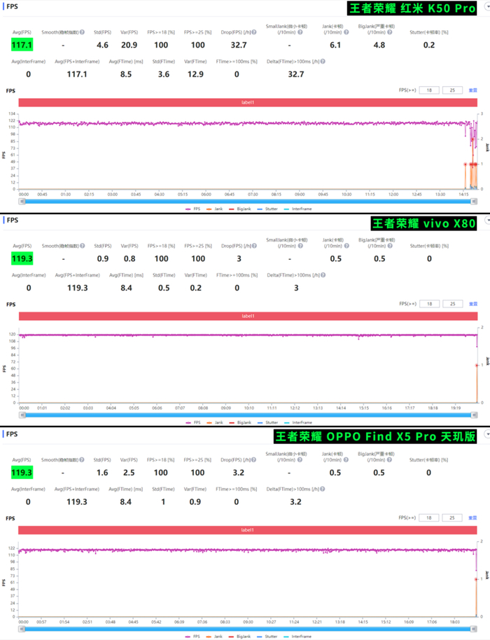 其中红米 K50 Pro 一局《王者荣耀 》下来的平均帧数为 117.1 帧,而蓝绿两位都是 119.3 帧。