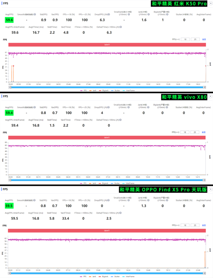 《 和平精英 》的数据则都差不多,米蓝绿三家分别是59.6、59.4 和 59.5 帧。