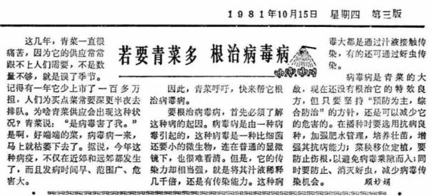 “记得有一年它少上市了一百多万担,人们为买点菜常要深更半夜去排队。为啥青菜供应会出现这种状况?青菜说:‘是病毒害了我。’”
