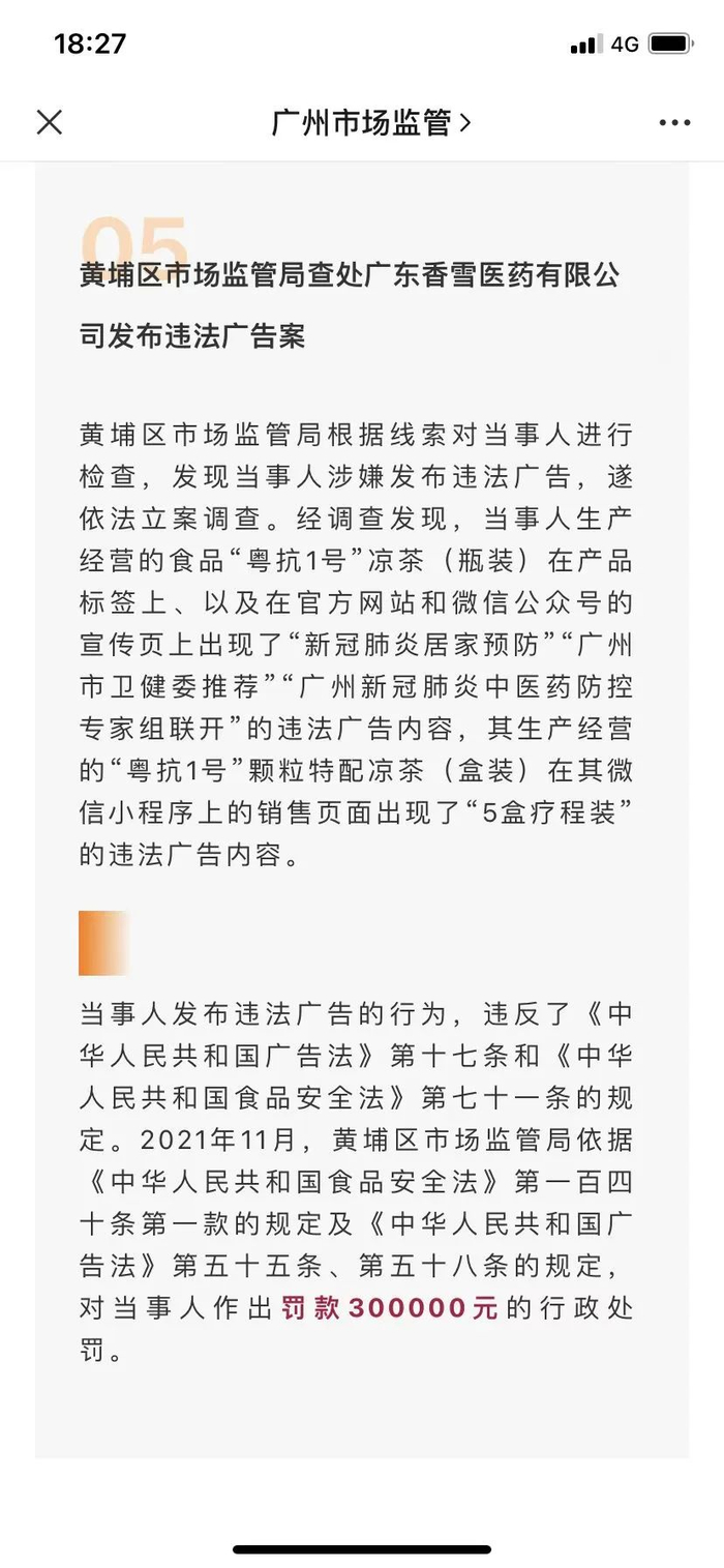 据广州市场监管微信公众号,经发现,香雪医药生产经营的食品“粤抗1号”凉茶(瓶装)在产品标签上、以及在官方网站和微信公众号的宣传页上出现了“新冠肺炎居家预防”“广州市卫健委推荐”“广州新冠肺炎中医药防控专家组联开”的违法广告内容,其生产经营的“粤抗1号”颗粒特配凉茶(盒装)在其微信小程序上的销售页面出现了“5盒疗程装”的违法广告内容。