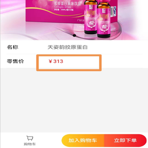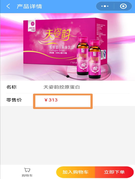 值得注意的是,目前九极生物已经停用该涉事小程序“九极通”,启用了一个新的小程序“九极康”,仍然有保留该款果味饮品,但已经没有了前述的广告宣传语。从该产品的价格来看,一盒10支装的(50毫升/支)卖到313元,合每支超过30元。