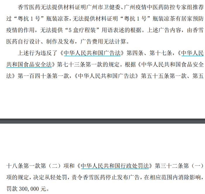 行政处罚决定书称,香雪医药无法提供材料证明广州市卫健委、广州疫情中医药防控专家组推荐过“粤抗1号”瓶装凉茶,无法提供材料证明“粤抗1号”瓶装凉茶有居家预防疫情的作用,无法提供“5盒疗程装”用语表述的根据。上述广告内容,由香雪医药自行设计、制作及发布,广告费用无法计算。