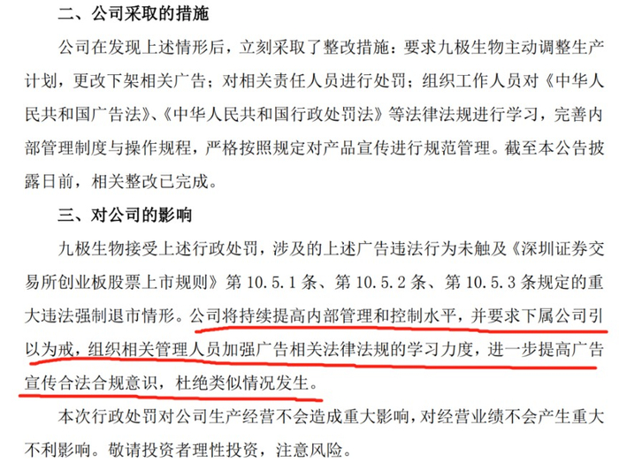 九极生物被罚之后,香雪制药表态“将持续提高内部管理和控制水平,并要求下属公司引以为戒,组织相关管理人员加强广告相关法律法规的学习力度,进一步提高广告宣传合法合规意识,杜绝类似情况发生”。