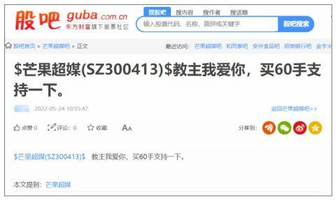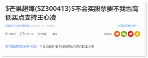 “王心凌男孩们”不仅用自己的身段表达着对偶像的热爱,甚至还用实际的钱包支持王心凌。在芒果超媒的股吧上,“你一票,我一票,心凌80还能跳。”的声援不绝于耳。有阔气的网友发文表示:“教主我爱你,买60手支持一下!”芒果超媒目前的股价在37.58元/股附近,60手所需耗费的金额大概是22万元,这可比在网络平台上打赏贵的多。也有网友发帖,”要不我也高低买点支持王心凌。”