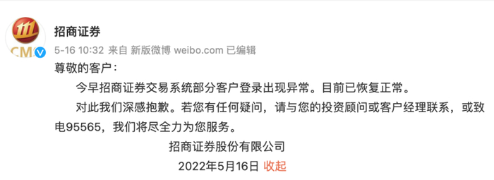 《每日经济新闻》记者了解到,2022年3月14日早间,“招商证券崩了”上了热搜;当日午间时分,招商证券表示,目前正在加紧修复,问题已经有所缓解。系统其他功能正常。3月15日,招商证券发布集中交易系统故障的情况说明并表示,故障已排除,系统服务恢复正常。不过,仅仅过去两个月,5月16日,招商证券又发生交易系统登录异常现象。