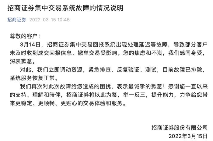 另外,就在招商证券3月14日出现交易系统故障后,深圳证监局也对招商证券出具了警示函处罚。深圳证监局称,招商证券在2022年3月14日的网络安全事件中,存在变更管理不完善,应急处置不及时、不到位等问题。