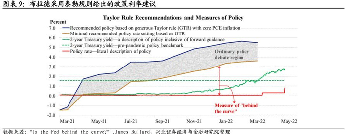 我们可以借用泰勒规则来测算联储在多大程度“behind the curve”。布拉德是今年FOMC的票委,他用泰勒规则测算出今年内联储需要至少加息至3.5%。如果我们仔细看他所选用的模型假定,可以发现这其实是在非常保守的假设下得出的政策利率建议。他所选用的泰勒方程为:Rt=R*+Π*+1.25(Πt-Π*)+min(ygapt,0),其中R*=-0.5%,Π*=2.0%,Πt=3.7%,Πt选用达拉斯联储的trimmed mean inflation,按照这个方程给出的政策利率建议是-0.5%+2.0%+1.25*(3.7%-2.0%)=3.63%。我们前文讨论过真实自然利率,-0.5%是个非常低的取值,这主要是布拉德考虑了美债作为全球安全资产对自然利率的压低。通胀选取的也是偏低的指标,美国3月PCE和核心PCE同比分别高达6.6%和5.2%。如果选用核心通胀的话,计算出的Rt应该为5.5%。按照布拉德的泰勒规则模型,美联储的政策利率应该设定在3.63-5.5%的范围,远高于当前的联邦基金利率以及2年期美债收益率,因此他认为联储目前远远落后于曲线。