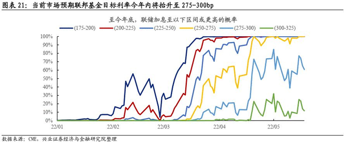 美联储看跌期权已经成为历史名词,联储加息幅度可能超出市场预期。美联储看跌期权指一旦美股剧烈调整,联储往往会放缓或者结束货币紧缩,从而对投资者形成类似看跌期权的保护效果。在此前联储采用“事前预防”的货币政策框架下,美联储看跌期权确实是存在的,但当前联储处于事后补救、追赶曲线阶段,美联储看跌期权已然不存在。更可能的情形是,美联储希望看到货币紧缩导致美股下跌,进而阻断“美股上涨-社会财富增加-财富效应下居民消费和企业资本开支上升-通胀压力加剧”的传导链条。一言以蔽之,一场美股熊市可能是恢复物价稳定的必要条件。当然,联储不会希望看到美股急跌进而触发流动性危机。只要金融体系的稳定运行不受威胁,联储对于美股“挤泡沫”乐见其成。衰退尚远、美股调整不足惧、通胀维持粘性的背景下,美联储加息之路不存在任何阻碍。当前市场的主流预期是年底联储将会把联邦基金目标利率抬升至275-300bp,这对应着6月、7月和9月FOMC加息50bp,11月和12月FOMC加息25bp,年内再加息200bp。这样的加息预期可能仍然不够充分。