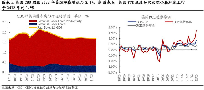 第一,美国2022年潜在增速比2018年更高,因此当前实际中性利率很可能高于2018年。潜在增速主要受劳动力供给、全要素生产率等中长期因素影响,财政政策也会对潜在增速产生影响。美国国会预算办公室(CBO)预测2022年美国潜在增速为2.1%,高于2018年的1.9%。据此推断,当前美国实际中性利率大概率也高于2018年。我们假设LW模型的系数是1,那么2022年美国实际中性利率可能在1.2%。