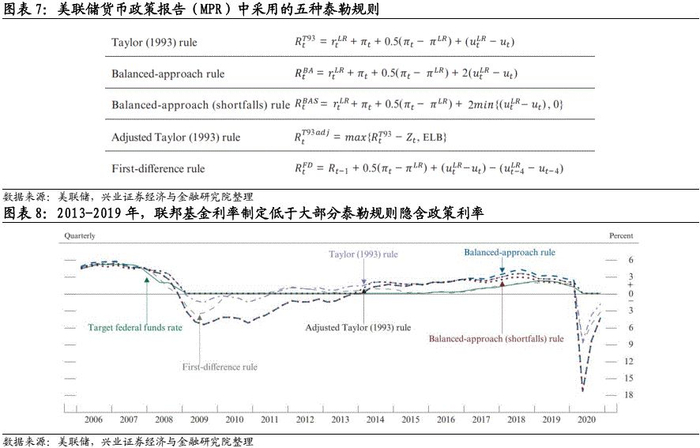 短期的政策利率制定需要借助泰勒规则的框架,以对通胀和产出缺口作出反应。前文所述的中性利率是针对长期维度(long run),对于短期政策利率的制定可能并不适用。中性利率是与经济体均衡状态相适应的利率水平,而如果经济体处于高通胀的过热状态,中性利率显然不足以帮助经济体降温至均衡水平。斯坦福大学教授Taylor在1993年提出的泰勒规则构建了名义政策利率对通胀和产出缺口的反应函数,被学术界和美联储广泛讨论并用作货币政策制定的参考。2017年起美联储发布的货币政策报告(MPR)会拿出单独一部分讨论泰勒规则和政策利率的制定,其中主要讨论了五种泰勒规则。需要说明的是,泰勒规则得出的政策利率对函数假定、变量选取、参数设定、自然利率估算等高度敏感,因此不同模型得出的结论差异非常大。这导致在实践中泰勒规则只能作为决策的参考,不能成为决策的终极指南。