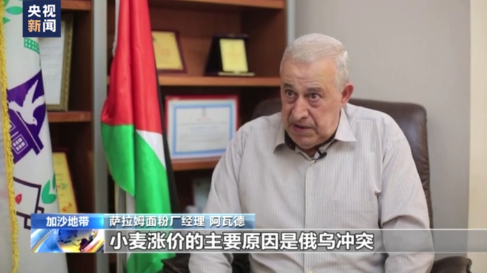 萨拉姆面粉厂负责人 阿瓦德:小麦涨价的主要原因是俄乌冲突,我们在加沙地带的工厂,最多只有2到3个月的库存。