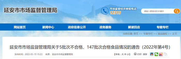 陕西延安市市场监管局关于5批次不合格、147批次合格食品情况的通告