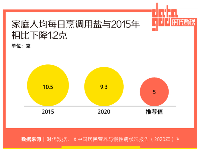 从政府、消费者到食品企业,在这支日渐壮大的减盐大军的行动之下,2021年,据国家卫健委最新通报,《中国居民营养与慢性病状况报告(2020年)》显示,我国居民家庭减盐取得成效,居民家庭人均每日烹调用盐降至9.3克,与2015年相比下降了1.2克,但与每日5克的推荐量相比差距仍然较大。