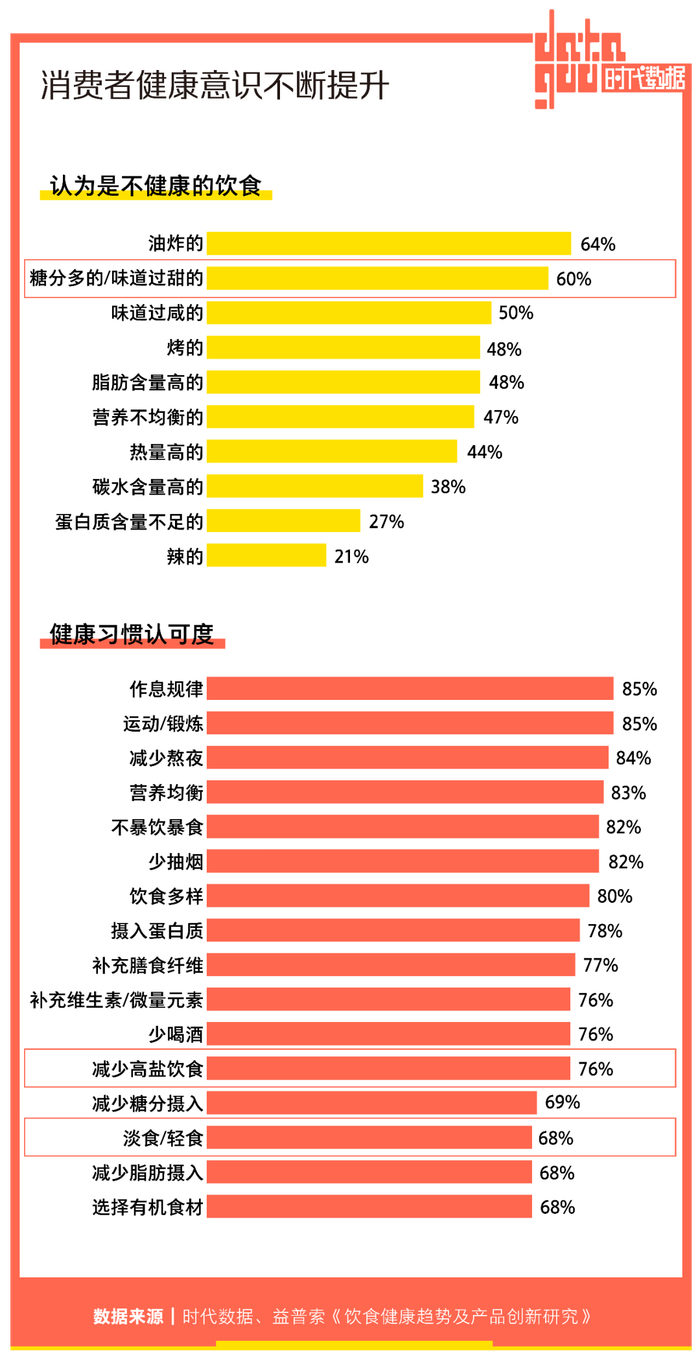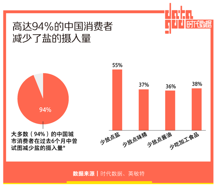市场研究咨询公司英敏特的一份报告显示,有高达94%的中国城市消费者曾试图减少盐的摄入量,55%的人会在烹饪时少放盐,超三分之一的消费者会少放味精和酱油。四分之一的已婚且有一个孩子的消费者会在意酱油产品的盐分高低。
