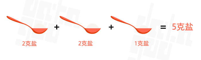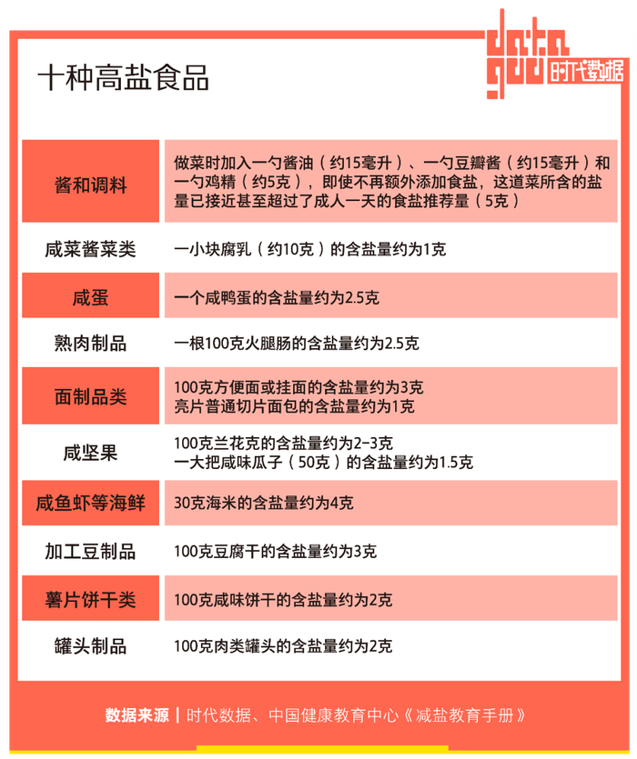 100克挂面就会让你吃进3克盐。做菜时加入一勺酱油(约15毫升)、一勺豆瓣酱(约15克)和一勺鸡精(约5克),即使不再另外添加盐,这道菜所含的盐量已接近7克。