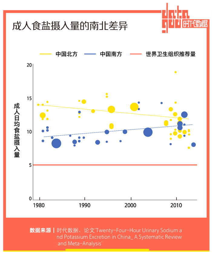 江湖传言“南甜北咸”,可南方人吃盐也不少。上述研究结果显示,中国北方居民食盐摄入量居全球最高之一(每日11.2克),但在1980年代每日高达12.8克,之后逐渐呈下降趋势,尤其到2000年后下降更快。这很大程度得归功于政府在提高全民减盐意识上的努力,再加上随着一年四季果蔬供给丰富,居民对腌菜、咸菜等高盐食品的依赖逐渐减少。
