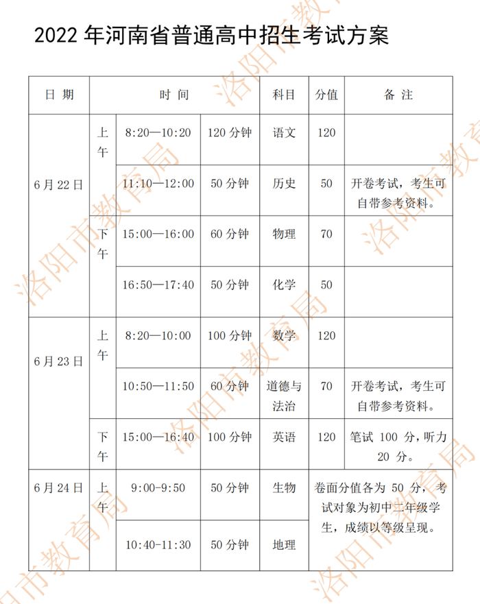 6.招收体育、艺术特色班的学校,体育、艺术特色班单独编班。考生一旦被体育、艺术特色班录取后,一律不得转入普通班。特色班指市提前批志愿中足球试验班和音乐、美术、舞蹈特色班,体育特长生指经洛阳市体育艺术卫生保健站审核通过,且专业测试合格的体育生,按照《洛阳市 2022 年中招体育特长生(尖子生)招生计划表》,报考专业指标相一致高中学校,才能被录取。