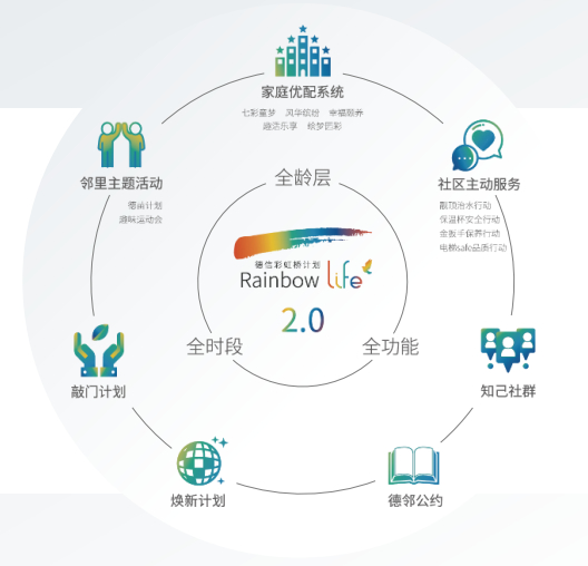 在“彩虹桥计划2.0”的升级下,德信的“彩虹桥”已经不再是一个简单物理空间的集合,而是以提升业主生活品质为目标,从传统的物业服务升级为社区综合服务,更多的关注到人的本身,通过家庭优配系统的全面焕新、社区服务的不断提档、社群的组建运营,逐步完善生活服务体系,以共享空间、共享情感,让业主尽享缤纷美好生活。