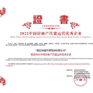 2022年3月31日,由中国企业评价协会,清华大学房地产研究所,北京中指信息技术研究院主办,北京中指信息技术研究院中国房地产TOP10研究组承办的“2022中国房地产百强企业研究成果发布会暨第十九届中国房地产百强企业家峰会”在北京盛大召开,会议发布了2022中国房地产行业最新研究成果。在代建研究方面,德信绿建集团凭借着全产业链的资源整合能力、投融资开发运营一体化服务以及多年在代建领域积累的优秀经验,首次荣膺“2022中国房地产代建运营优秀企业”。