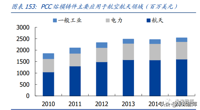 以两机零部件企业 PCC 为代表映射航发产业链的长坡厚雪:需求端持续增长叠加供给 端少数垄断造就利润端稳定增长,获得稳定持续的经营。PCC 是全球高端精密零部件龙 头,下游应用主要是航空航天领域。PCC 创立于 1968 年,总部位于美国俄勒冈州波特 兰市,是一家精密金属零件制造公司,主营熔模铸造、锻件、紧固件三大类产品,2015 年营收占比分别为 25%、43%和 32%。公司下游应用领域包括航空航天、能源和一般工 业市场,下游营收占比分别为 69.6%、17.2%、13.2%。
