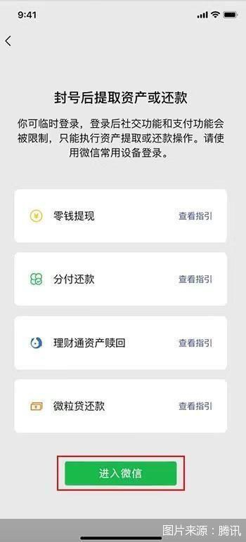 在封号后提取资产或还款的相关事宜上,用户可以按照页面提示,根据指引自主开启临时财产入口登录微信,并进行零钱提现、零钱通转出、银行储蓄转出、理财通资产赎回以及微粒贷还款等操作。财产入口开启后,48小时内有效,且仅限于财产提现或还款操作,微信其他社交、支付等功能无法使用。