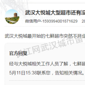 5月17日,东湖新技术开发区管委会在武汉城市留言板回复称,经与大悦城相关工作人员了解,七鲜超市已终止与大悦城合作,目前商场正在积极洽谈储备商家。