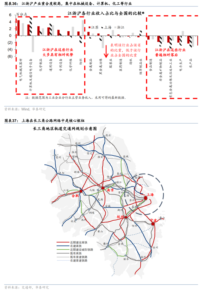 上海在全国出口贸易、跨国航运及航班、及外商直接投资的占比远高于其总产值。江浙地区亦然。受益于区位优势、以及以浦东开发开放为代表的先发制度优势,上海及周边地区已发展成为重要的国际交通枢纽,物流集散中心,外贸出口大市,及外商投资胜地。截至2021 年,仅上海本地占全国实际利用外资的 13%、外贸货物吞吐量的 10%、出口额的 7%,而江浙沪区域三项占比分别达到 40%、28%、36%。此外,上海是国内跨国公司地区总部最集中的城市。截至 2021 年底,上海累计吸引 831 家跨国公司地区总部、506 家外资研发中心,且集齐了全部世界 500 强企业。