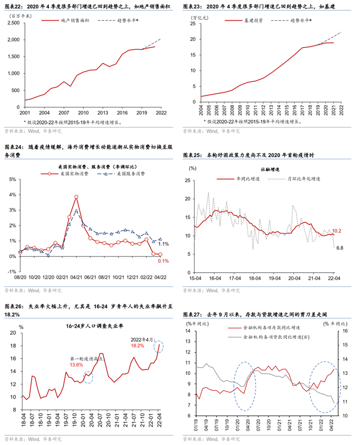 此外,我们在 2020 年首轮疫情后已观察到服务业恢复相比制造业更为缓慢,而这轮服务业的复苏可能更为艰难。随着疫情的持续,中小企业面临诸多困难,失业率上升(如 4 月城镇调查失业率上升至 6.1%、16-24 岁青年人失业率已飙升至 18.2%,图表 26),居民消费的潜力可能已有所下降。此外,4 月疫情升级推升被动储蓄并进一步打击融资需求,使得消费需求回升的前景不容乐观(图表 27)。