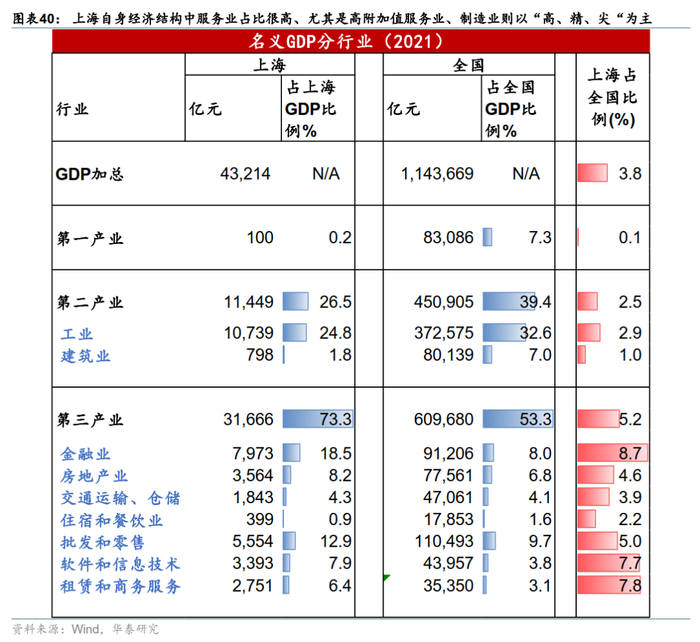 1)上海自身经济结构中服务业占比相当高,制造业则以“高、精、尖“为主。第三产业GDP 占上海总 GDP 的 73.3%,显著高于全国整体水平 53.3%。工业在上海 GDP 中的占比为 24.8%,虽不及全国整体水平,但其产业结构更倾向于中高端制造(图表 40)。例如,仅汽车行业便占到上海规上工业收入总额的 20%,而设备制造、计算机和化工则分别占到13%,13%和 9%(图表 41)。