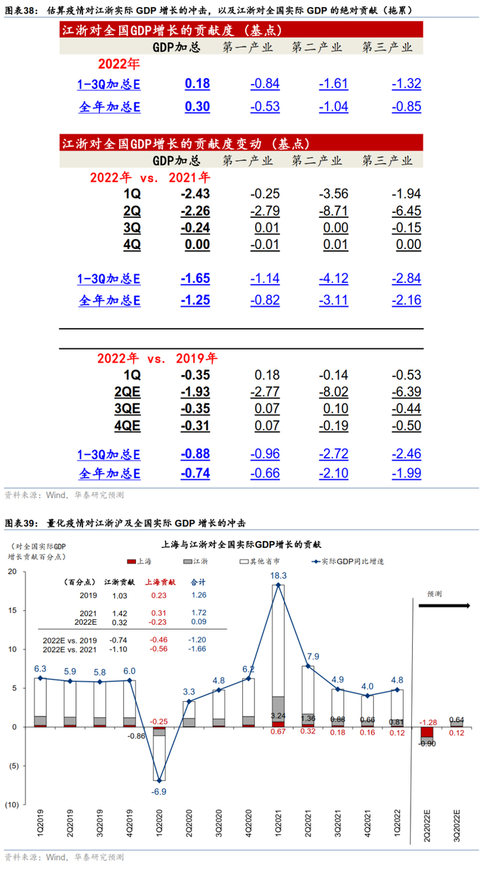 值得强调的是,与上海高度融合的江浙区域受疫情影响较为严重、本身体量亦大,可能显著拖累全国经济增速——江浙沪经济总产值占全国五分之一强、占全国快递收发量的 3 成、出口量及 FDI 约 4 成(图表 34 和 35)。从产业分布上看,上海和江苏、浙江产业重合度相当高,在机械设备、计算机、化工等行业可谓是休戚相关(图表 36),因此江浙地区受到上海疫情的影响在所难免。从物流、人流和防控政策跟踪等高频指标观察,我们估算江浙所受影响可能在疫情对上海冲击值的 1/4-1/3 左右。但由于江浙两省总产值 4 倍于上海,所以江浙 GDP 所受冲击的绝对值可能与上海相近。即使不考虑对其他省市的“辐射效应”,今年 1-3 季度江浙两省对全国实际 GDP 增速的贡献或将只有 0.18 个百分点,比 2021 年1-3 季度少约 1.6 个百分点(图表 38 和 39)。