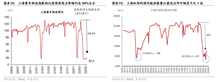 2)当前物流、地产交易、客运等一系列高频指标显示,上海经济活动 3 月开始显著下滑,5 月以来比疫情最严重时期恢复约一成,相比疫情前仍然大幅收缩;经济指标低点与 2020年初武汉较为类似、部分略强。截至 5 月 15 日,上海的拥堵延时指数相比 4 月 11 日的低点回升 19%,但仍大幅低于疫情前高点(3 月初)水平,对比 2020 年武汉疫情爆发后,降幅约为 7-8 成(图表 8 和 9)。受疫情防控限制,公共交通人流量的降幅相比拥堵指数更为显著:尽管上海“社会面”感染已趋零,但公共交通仍处关闭状态、4 月 1 日以来上海地铁客运量持续在零左右徘徊,降幅与 2020 年初的武汉已相当接近(图表 10 和 11)。人流量下降也意味着大部分经济活动均会受到影响:以房地产为例,房地产销售和投资等数据均受到疫情大幅冲击:上海商品房成交量自3月初开始显著下滑,4月至5月中旬均几近停滞、成交面积同比降幅超过 9 成;这与 2020 年武汉疫情爆发后的房地产市场基本相同(图表12 和 13)。另一方面,上海 4 月土地成交面积同比下降 54%、5 月前两周同比下降 21%,考虑到建安投资停工为普遍现象,这意味着房地产投资数据的收缩幅度可能也会相当显著;2020 年武汉疫情爆发后,土地成交经历了全面“暂停”、比上海本轮疫情影响更甚。此外,截至 5 月 15 日,上海整车物流指数相比疫情前高点降幅仍在 84%左右、上海机场的国内航班数量从最低点回升幅度不足 1 成(图表 14 和 15)。