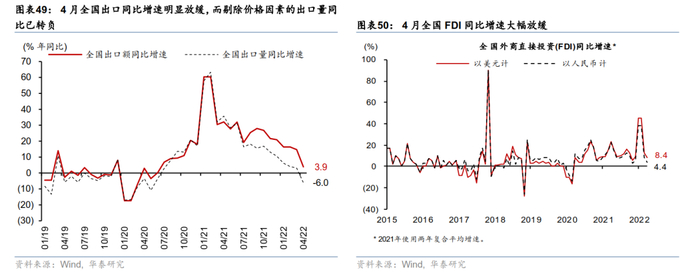 4 月以来,全国出口增长、利用外资增速均明显下滑,可能也体现了上海抗疫带来的辐射性影响。今年 4 月,全国以美元计的出口同比增速从 3 月的 14.9%大幅下滑至 3.9%,而剔除价格因素后,出口量同比可能已滑落至-6%左右(图表 49)。分产品看,集成电路、手机、汽车等上海占比较高行业的出口增速均大幅下滑,显示上海抗疫对出口的影响明显加剧。与此同时,全国 FDI 同比增速从年初高双位数的水平大幅下降至 4 月单位数的水平,其中上海疫情的影响可能不容小觑(图表 50)。