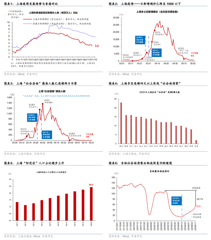 上海“社会面”感染人数连续清零,疫情高点已过,进入“整固期”。从日确诊人数看,上海疫情已于 4 月 13 日越过高点(当日新增感染 27,719 例),日新增感染人数降至 5 月 21日的 622 例(其中确诊 52 例、无症状感染者 570 例,图表 1 和 2)。截至 5 月 21 日 24 时,尚在治疗中的本土确诊病例有 2,917 例、较前日减少 294 例;4 月 17 日至 5 月 21 日,合计死亡病例为 584 例。从社会面(含管控区、防范区,以及非闭环管理的社会流动人员等)感染的角度看,上海于 4 月 29 日首次出现社会面零新增,随后至今虽有反复,但 4 月 30日、5 月 10 日、5 月 14-18 日和 5 月 20-21 日均无社会面新增感染者(图表 3)。5 月 13日的疫情防控发布会上,上海提出目标,即在 5 月中旬实现社会面清零;届时实施有序放开、有限流动、有效管控和分类管理。根据其最新标准,以行政区为单位,如果连续三天单日新增数占区内总人口数比例小于十万分之一,就可以认为“社会面基本清零”;如果连续三天单日新增数为零,就可以认为实现了“社会面清零”。截至 5 月 21 日,上海 16 个区中,有 13 个区已经实现连续 10 天以上的“社会层面”清零、可以认为已达到目标;防范区占常住人口比例已达到 84%(图表 4 和 5)。