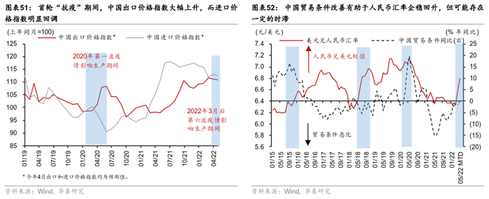 值得注意的是,首轮“抗疫”期间,中国出口价格指数大幅上升、而进口价格指数明显回调。近期人民币及国际制造业/大宗商品价格的比值也在重现这一规律。作为全球最大的制造中心,中国生产端在疫情初期受到的冲击将明显推升中国出口价格指数,并拖累进口价格指数下跌,即推动中国贸易条件改善(图表 51)。另一方面,疫情初期中国生产效率受损会导致人民币汇率走弱。随后中国贸易条件改善将有助于人民币汇率企稳回升(图表 52)。对标 2020 年,我们预计这次疫情对人民币汇率的影响可能在疫情高点过去后还会延续 2 个月左右,即人民币汇率有望在 6 月底左右企稳回升。