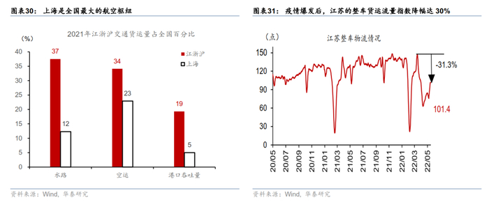 这种“辐射”影响首先体现在交通——疫情爆发后,上海自身交通运力大幅削减,迅速波及周边地区、甚至全国。上海是全国最大的航空货运/客运枢纽,2021 年其空运货运量占全国的 22.9%、2019-2022 年上海国际航班数量在全国占比 7%;此外,上海港是全国第二大港,吞吐量占到全国的 5%,仅次于宁波-舟山港(图表 30)。疫情爆发后,上海的整车货运流量指数大幅下滑至 20 左右,相比 3 月上旬的 110 以上降幅逾 8 成。同时,江苏和浙江的整车货运流量指数亦同步下滑,降幅分别达 30%和 15%(图表 31);而在江浙沪以外,安徽、河南、湖北、江西及福建等地的交通运力也有所受损。