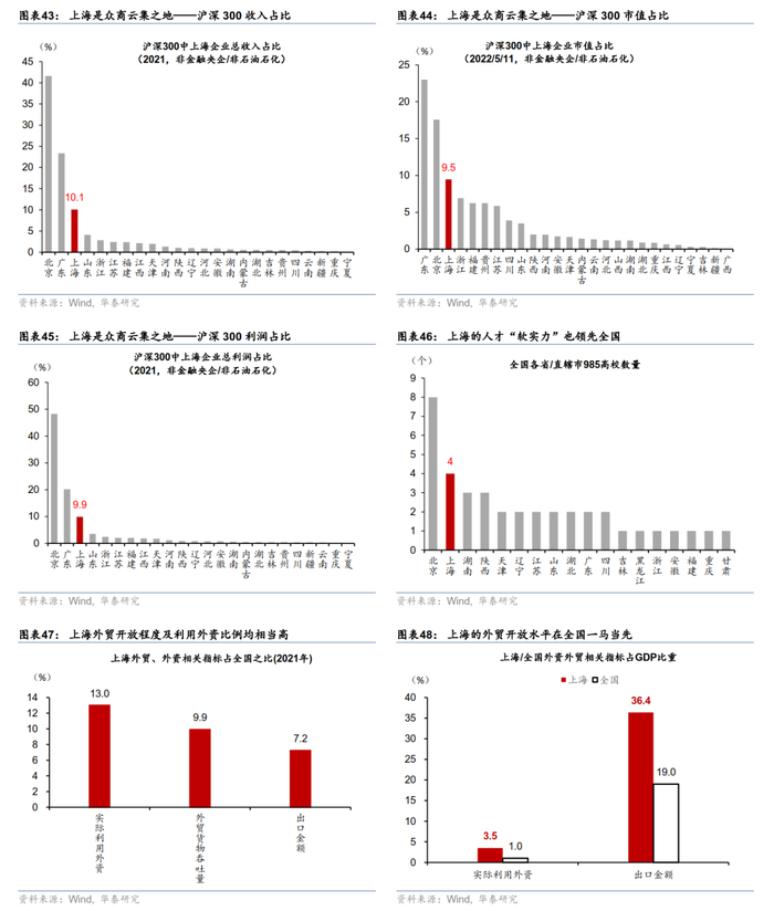 此外,可能更值一提的是,除了金融、贸易、交运等行业之外,上海在教育和营商环境等方面的“软实力”在全国尤其突出,而疫情在这些方面的“辐射性”影响也应引起注意。上海有 4 所全国知名的 985 高校,在全国各省中仅次于北京,同时上海是全国高校毕业生就业的最向往的城市之一。在沪深 300 家上市公司中,上海注册的企业市值占比仅次于北京和广东,达 9.5%,收入和盈利占比亦位居第三。此外,得益于过去四十年的积累,上海在吸引外资方面已具备相当优势:2021 年上海实到外资金额达 223 亿美元,同比增长 11.5%,在全国占比达 13%(图表 43-48);新设外资企业 6708 家,同比增长 16.6%。本轮疫情冲击过后,稳固市场主体信心和稳就业必将成为当务之急。