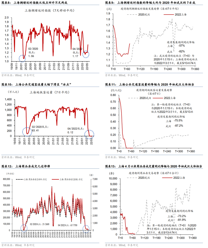 对照 2020 年 1 季度武汉经济活动所受冲击推演——3-5 月、即上海本轮疫情期间,人流、物流、生产、房地产等各方面经济活动的下滑幅度大体相当于 2020 年初武汉疫情期间的七成到十成不等。