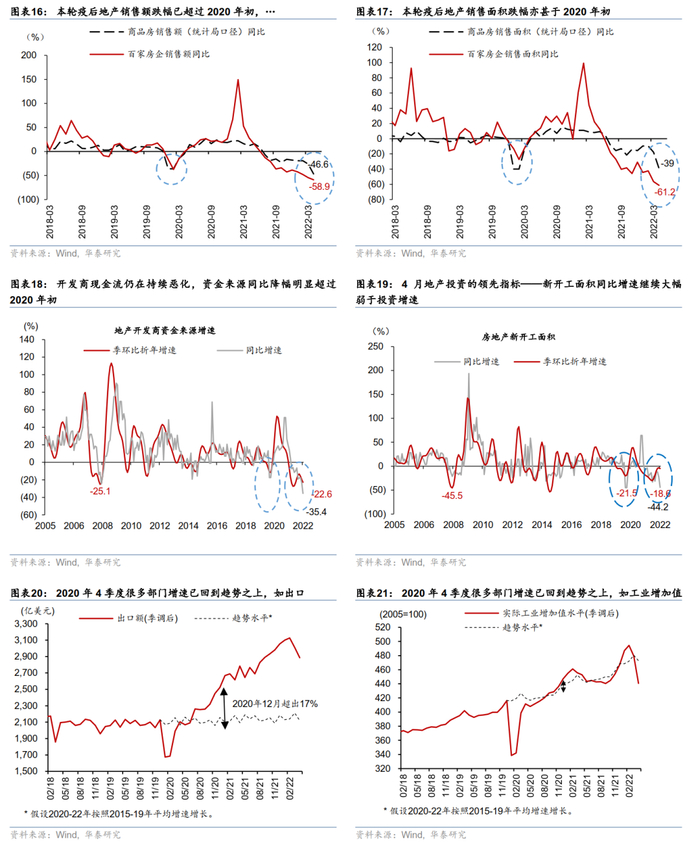 在地产去杠杆的宏观背景下,本轮疫情冲击导致经济下行压力较 2020 年初更为显著。4 月房地产开发投资同比增速从 3 月的-2.4%明显下滑至-10.1%。4 月全国地产销售额和销售面积同比分别下跌 47%、39%,而百城房企销售额和销售面积同比降幅更是分别扩大至 59%、61%,两者跌幅均已超过 2020 年初跌幅,5 月或进一步加深(图表 16 和 17)。房地产销售持续低迷可能导致开发商现金流进一步恶化,4 月开发商到位资金同比增速进一步下滑至-35.4%,而 4 月地产新开工面积同比增速也从 3 月的-22.2%快速下降至-44.2%(图表18 和 19)。在地产去杠杆的背景下,疫情冲击加剧了金融系统的表观“脆弱性”,企业、个人及地产去杠杆下相关的现金流压力可能已形成“负反馈”,迫切需要稳定金融市场预期,打破流动性和信用收缩的“负循环”,防止流动性急症成“痼疾”。