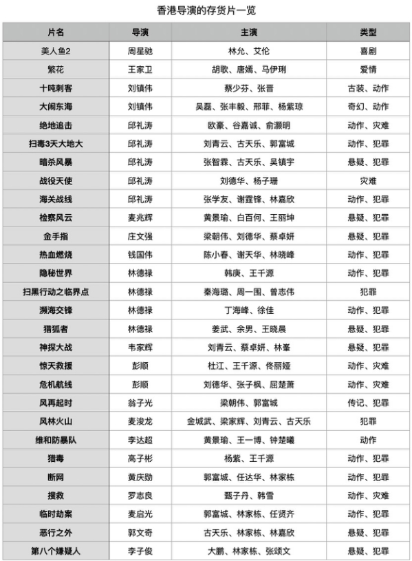 硬糖君马上梳理了一下待映库存,果不其然。香港导演还真是积压大户。拍完未上映的香港导演影片中,光是演员阵容有卖相的,就至少50部。