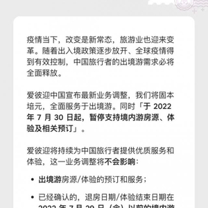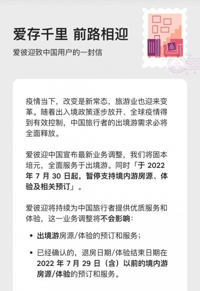 进入中国6年多后,5月24日上午,Airbnb发布了致中国用户的一封信,其中提到:Airbnb中国宣布最新业务调整,我们将固本培元,全面服务于出境游,同时于2022年7月30日起,暂停支持境内游房源、体验及相关预订。