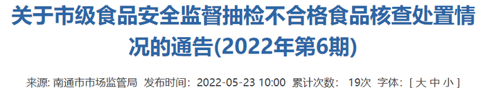 中国质量新闻网讯 2022年5月23日,江苏省南通市市场监督管理局根据《南通市2021年食品安全监督抽检结果公告》(第十二期)、(第十三期),将部分不合格食品的核查处置情况通告(2022年第6期)如下: